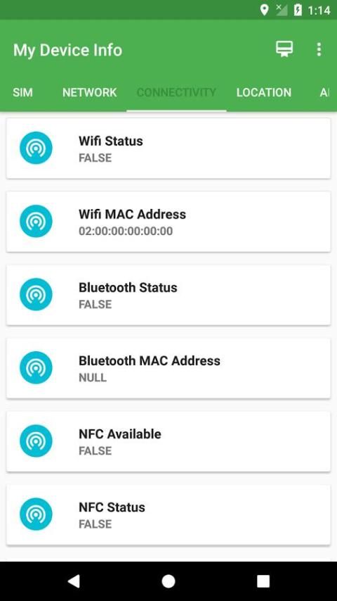 Konektivitas : Status Wifi, Wifi MAC Address, Status Bluetooth, Bluetooth MAC Address, NFC Tersedia, NFC Status.