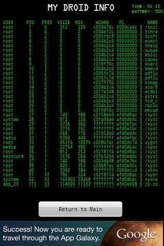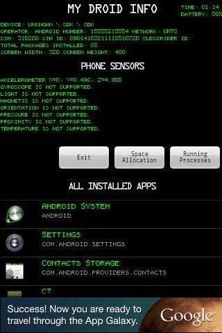 My Droid Info provides you with the necessary basic information regarding your phone and the various sensors that may be available along with their readings. You can use this to also check if your various sensors are operating correctly and at the same time check running processes and file allocations.