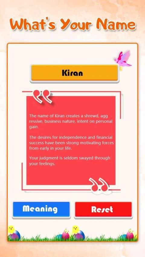 Aplikasi ini menarik, menyenangkan dan praktis. Informasi dalam nama Anda dapat mengungkapkan nasib Anda. Arti nama Aplikasi membantu Anda memeriksa apa yang ada di balik nama dan kisah rahasia Anda.