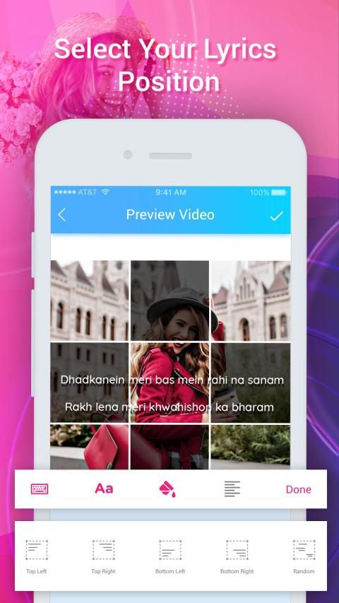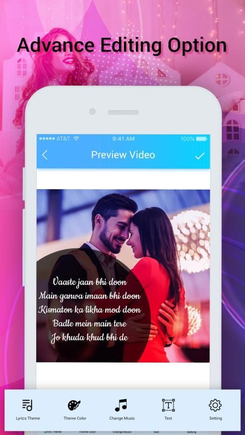 have great collection of songs lyrics select your favourite lyrics and add them on your pictures and make lyrical video of your own pictures and share your feelings with your love using your photo lyrical video. Create 30 seconds lyrical video. 30 second video maker. Share your created video via social media and its sure your words touch your loved ones heart by this video.