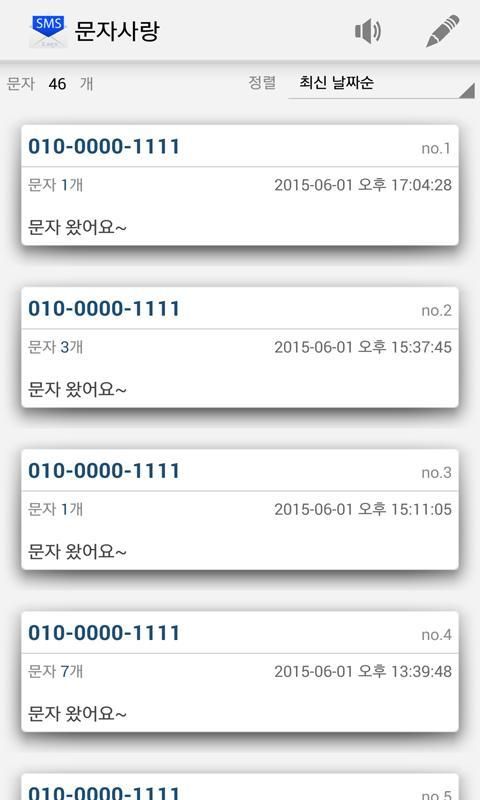 * SMS(단문), MMS (멀티미디어) 문자메시지 배경색을 받은내용(노랑색), 보낸내용(파란색)으로 구분하여 표시.