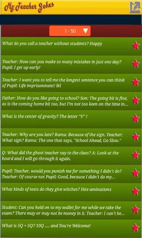 Ambil yang terbaik saya Guru Jokes aplikasi, di mana Anda dapat menemukan tanda kutip yang paling unik, lucu dan lucu dalam bahasa Inggris Jokes. Banyak lelucon guru, murid, sekolah yang membuat Anda tertawa terbahak-bahak.