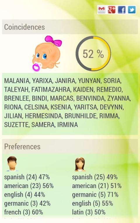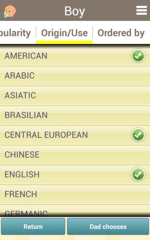 Setelah gadis atau anak laki-laki yang dipilih, kita akan mendapatkan daftar nama di mana kedua Mom dan Dad secara terpisah memilih favorit mereka.