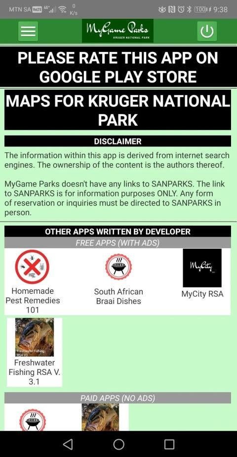 Semua informasi tertanam di dalam aplikasi kecuali file video. Peta terperinci dari Taman Nasional Kruger serta jarak antara kamp dapat ditemukan melalui tombol Informasi di kiri bawah. Ada juga referensi ke aplikasi lain dari pengembang.