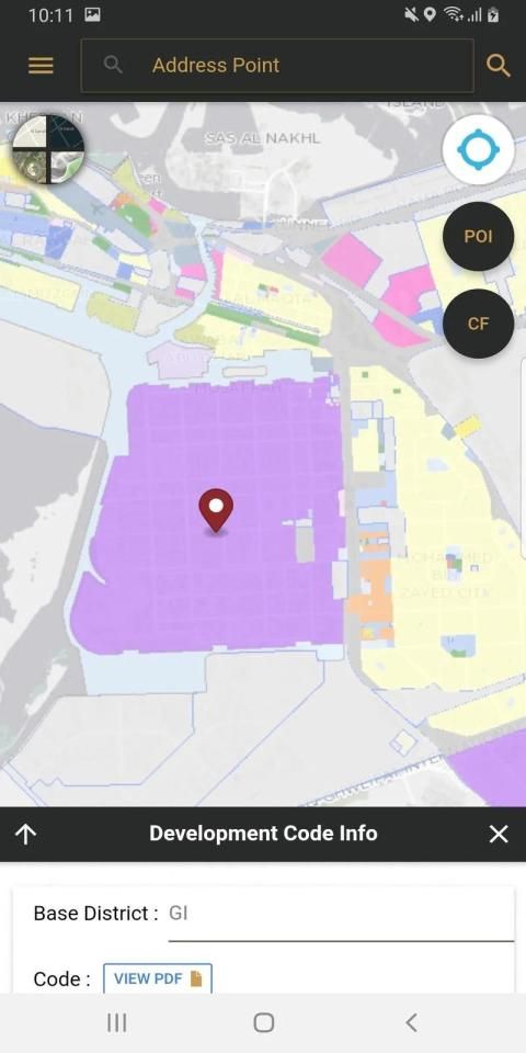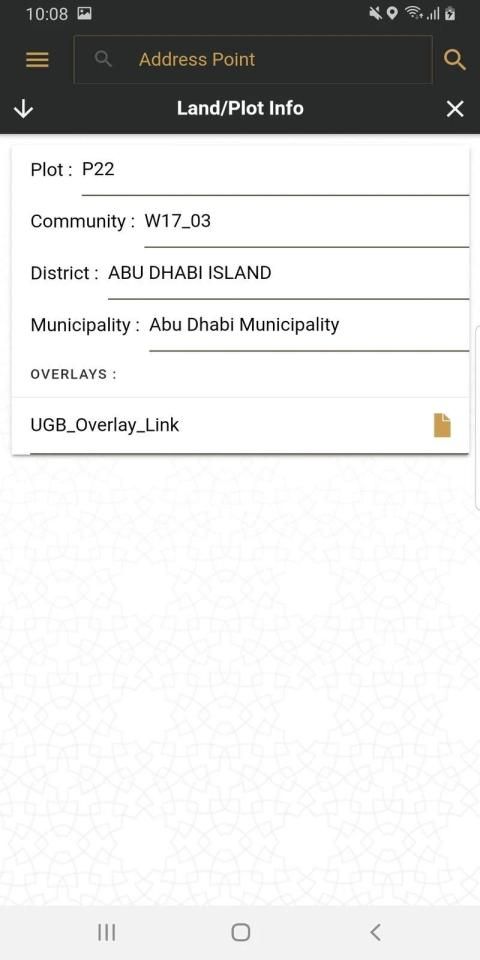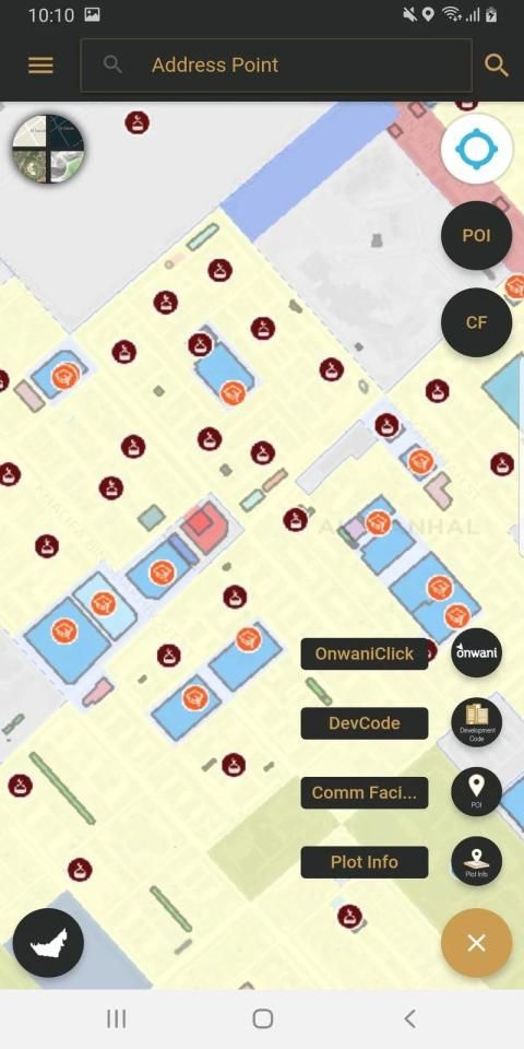 Onwani addressing functions in MyLand include locating of address points, street names, districts, QR code location. The Siteplan module of the MyLand are related to plots and land information. Users can scan the QR code on the printed Siteplan from Abu Dhabi Land Management system to display the plot and its information in MyLand application. Plot information from three Municipalities can be searched in MyLand using zone, sector, road, plot no. MyLand also displays other GIS overlays like Building development code, admin boundaries. The application also provide information about allocated land for community facility and its built up condition as well as the licensed community facilities locations.