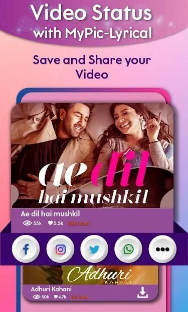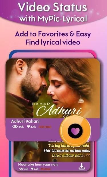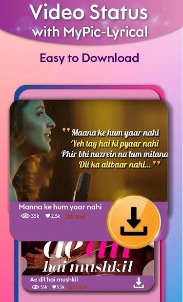 If you like share videos on social media with your photos and lyrics than this wonderful application made for you. And also there is a new craze on social media to share lyrical video songs. We introduce you MyPic - Lyrical with Video Status application with new concept which helps you to make lyrical video of your own beautiful photos. Lyrical video for WhatsApp status makes awesome video status. A picture says a lot and adding song lyrics on that picture make it more unique.