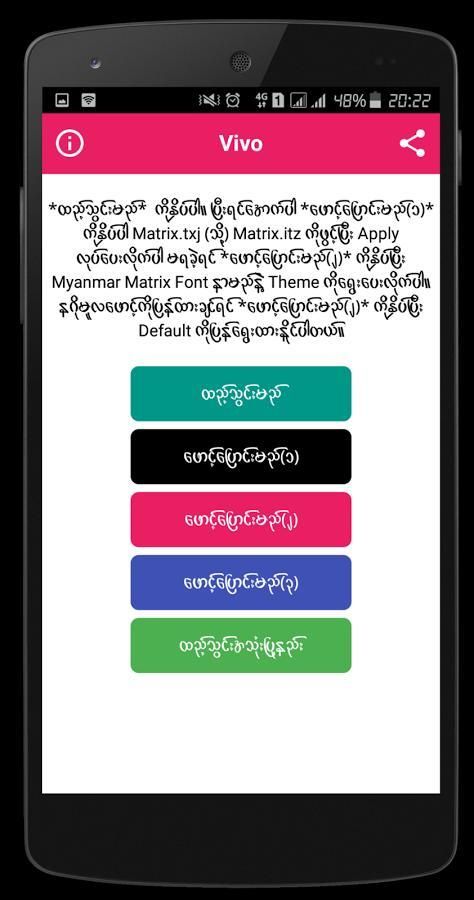 Following is the introduction of a wonderful App. 20,000+ users downloaded Myanmar Matrix Font latest version on 9Apps for free every week! Therefore, people are willing to accept this latest version. This hot app was released on 2017-06-04. For more mobile apps information, you can go to our official website - 9Apps.