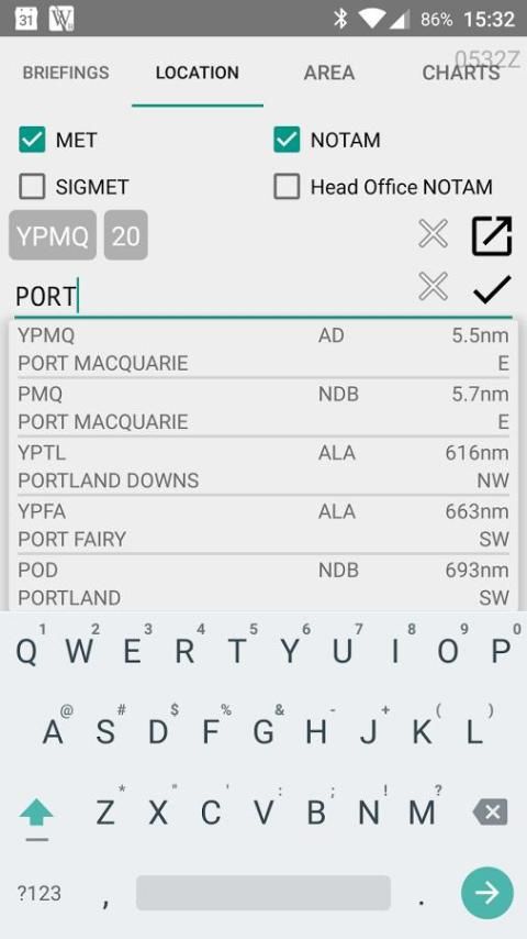 Lokasi pencarian menggunakan database on-device dengan semua lapangan udara Australia, ALA, navaids dan kedua VFR dan IFR waypoints disertakan. Koordinat dan jarak dan arah dari lokasi Anda saat ditampilkan, bersama dengan pertama / terakhir kali cahaya.