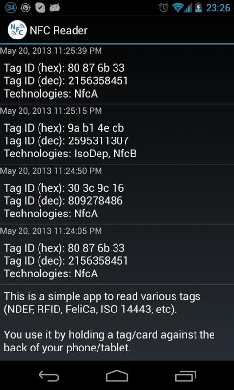 Aplikasi sederhana untuk membaca berbagai tag (NDEF, RFID, Felica, ISO 14443, dll) dengan menggunakan NFC (Near Field Communication).