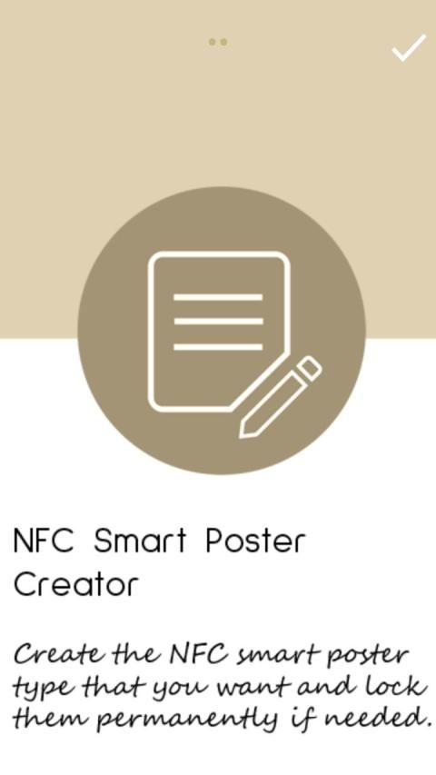 NFC Smart Poster - Juga membantu pembuat poster pintar untuk membuat tag NFC tipe SP (smart-poster) dan menguncinya secara permanen, sehingga tidak ada orang lain yang dapat mengubah konten tag.