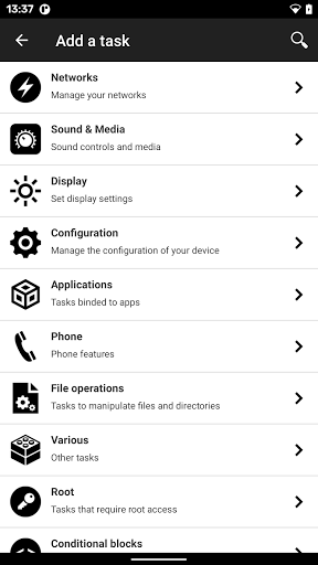 Tugas yang memungkinkan Anda untuk mengotomatiskan ponsel Anda berada di bawah & quot; tugas & quot;tab dan dikategorikan.