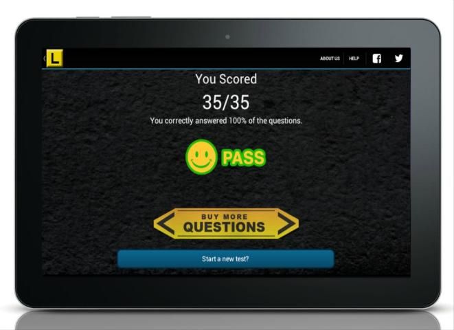 Setelah Anda menyelesaikan tes Anda akan diberi skor dan aplikasi akan memberitahu Anda jika skor Anda akan cukup untuk lulus nyata Badan Transportasi Selandia Baru (NZTA) tes driver lisensi.