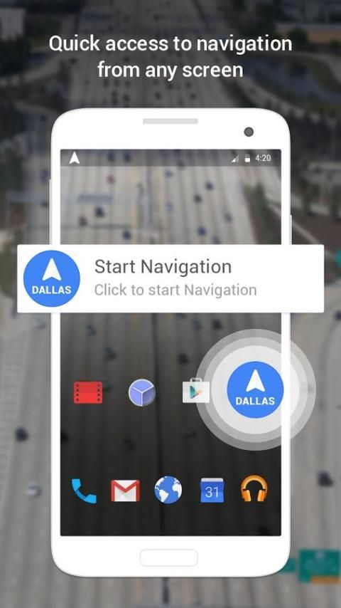 Navigasi Dallas Peta & lalu lintas adalah shortcut aplikasi satu-tap dengan floating ikon aplikasi dari layar apapun pada perangkat Anda. Apapun layar yang sedang Anda gunakan, ikon Navigasi masih dapat diakses pada lapisan atas pada layar ponsel Anda. Mengakses Navigasi belum pernah lebih mudah. Membuka aplikasi, masukkan tujuan Anda dan menikmati perjalanan Anda.