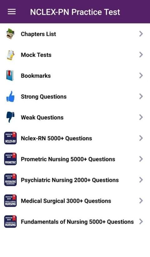 NCLEX-PN Kuis 5000 + Pertanyaan aplikasi gratis membantu untuk mempersiapkan Anda Ujian NCLEX-PN dan BOARD dan lisensi lebih banyak Ujian. Dalam aplikasi ini kami menyediakan sejumlah besar tes praktek dan tes mengejek dengan praktik terbaik untuk sukses dalam Ujian NCLEX Anda.