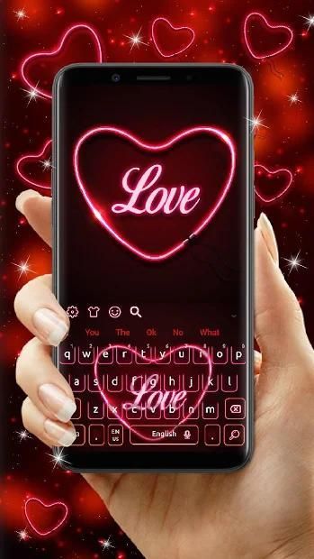 The Beautiful Shiny Neon Love Heart Keyboard Theme effect will bring a stylish of fashion in your life and show everyone your good taste in stylish neon heart love theme with beautiful red background and shiny neon decorated keyboard keys this both combination make your mobile phone beautiful look.