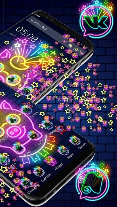 Neon icons pack-change your icons and folder for making it more beautiful, amazing color. Remove dullness. neither you need to buy new phone nor need to waste money for removing dullness. Neon Pig Gravity Theme removes your screen dullness and changes into new wallpaper and icons very dark and lighting. Provides you special wallpaper: - stars gravity on wallpaper. You can shake it. this is easy in switching and navigation