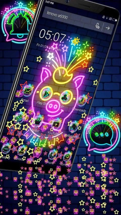 Guys you will be surprised to know that now you can apply neon pig gravity for giving modern look. Lighting background with amazing piggy. In this theme you will get stars gravity that you can shake on the wallpaper for your enjoyment or increasing beauty of theme.