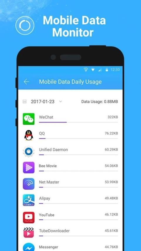Memantau penggunaan data seluler dan Wi-Fi, daftar dengan hari dan bulan. Mengirim pemberitahuan kepada Anda ketika data seluler Anda hampir habis. Terlebih lagi, Anda juga dapat memeriksa aplikasi menggunakan lalu lintas yang paling dan mengambil tindakan untuk mendistribusikan data Anda lebih cukup.