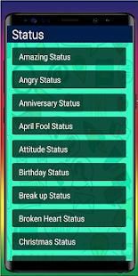 Semua status dibagi menjadi beberapa kategori seperti Status Lucu, Status, status Tahun Baru, status Sad, status bagus, status Man, status wanita, status Pintar, status Hidup, status Joke.
