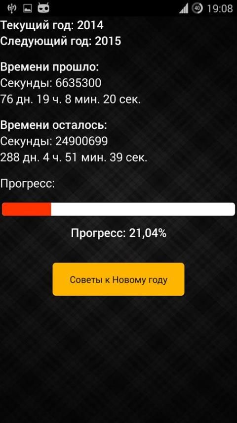 Timer adalah aplikasi sederhana yang menunjukkan hitungan mundur dari terakhir Tahun Baru, serta sisa waktu sampai tahun depan. Menu kedua akan membantu Anda saran tentang cara untuk menghabiskan waktu di tahun untuk kepentingan diri mereka sendiri dan kesehatan mereka.