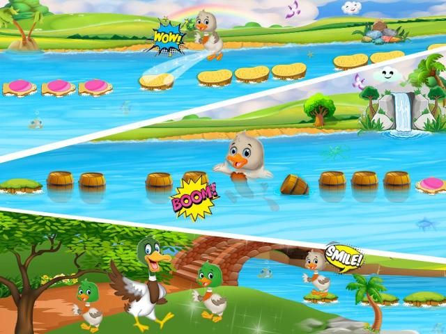 Enjoy with ugly duck by jumping on stones and reach the edge of the pond.