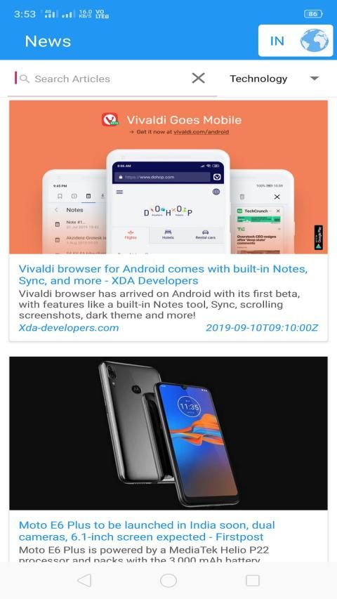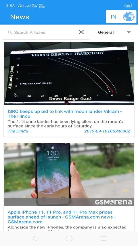 Aplikasi Berita menyediakan tajuk berita utama dan utama untuk suatu negara, kategori tertentu di suatu negara, sumber tunggal, atau banyak sumber. Anda juga dapat mencari dengan kata kunci. Artikel diurutkan berdasarkan tanggal paling awal yang dipublikasikan pertama.