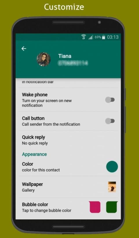• Customization: Changing background wallpaper , bubble styles , font and bubble colors.