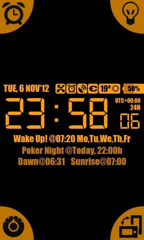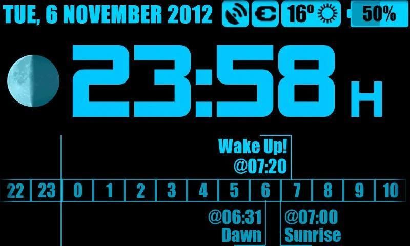 * Full screen clock, custom color, clock font, portrait/landscape, moon shape, status bar, date, timezone, time with seconds...