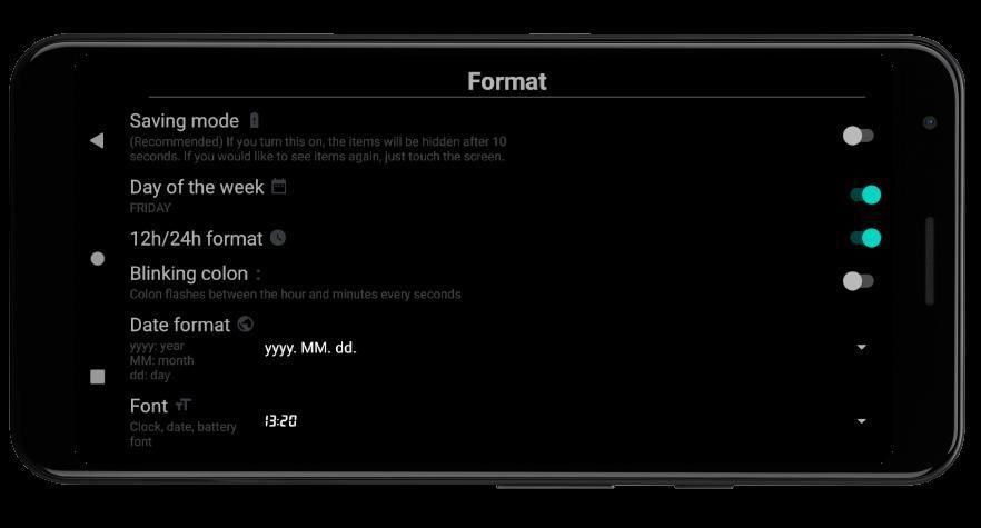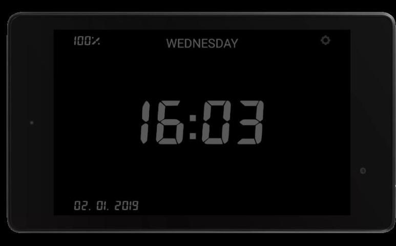Features: digital clock, date, battery and more, which are can be set, as the size and the color of the clock. Saving mode is available too in night clock settings, which means that if you swicht it on, the items will be hidden after 10 seconds. If you would like to see night clock again, just touch the screen.