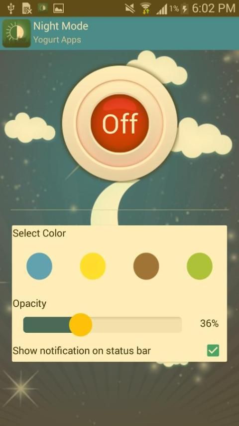 layar redup dan memungkinkan Anda memilih warna Anda sendiri. Anda akan memiliki empat warna untuk memilih dari dan Anda dapat mengatur opacity sesuai dengan kenyamanan mata Anda.