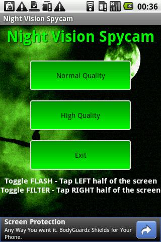 This is night vision camera This application allows you to see things in low light conditions at night for example. Like real night vision, it requires some light it39;s based on camera and actually enhance the visible image using special algorithm it39;s NOT only the green filter You can toggle filter modes and use flash light if available.NOTE: You won39;t see anything in total darkness. It39;s based on camera so if camera sees nothing black all you can see is green or white screen. There39;s no miracle.Features: real image enhance algorithm not just a filter two image resolutions 320x240 and 640x480 choose the best combination of quality and speed for your device two image filters green like real night vision device, shades of gray you may use flashlight if available may not work on every device, i.e. Samsung Phones requires android 2.1 or higherUsage:Choose normal quality or high qualityTap left half of the screen to toggle flashlight onoffTap right half of the screen to toggle filters greengrayNetwork permissions required only to display ads.