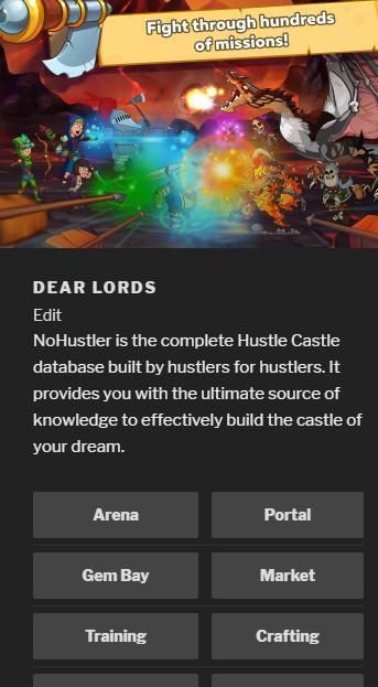 NoHustler is the complete Hustle Castle database built by hustlers for hustlers. It provides you with the ultimate source of knowledge to effectively build the castle of your dream.