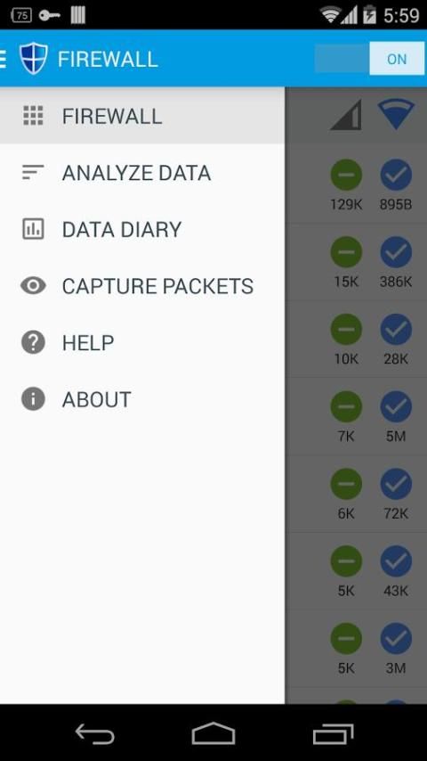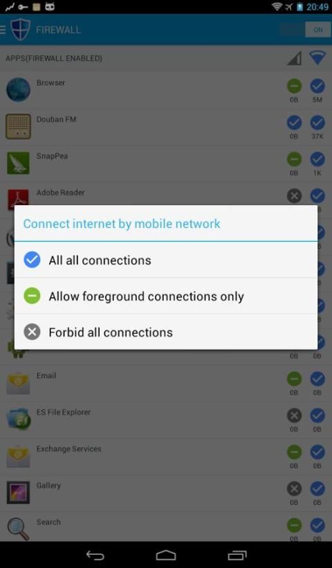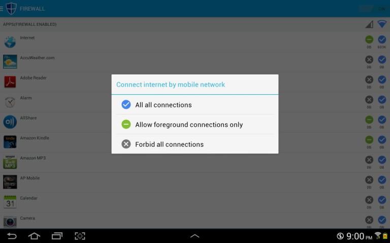 * Kontrol izin akses untuk setiap aplikasi untuk mengakses internet dengan jaringan selular dan jaringan WIFI.