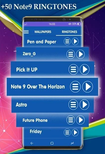 Following is the introduction of a wonderful App. 20,000+ users downloaded Note 9 Wallpapers/Ringtones latest version on 9Apps for free every week! You can find this multifunction app on 9Apps easily. This hot app was released on 2018-09-10. I will tell you how to use this app in the following page.