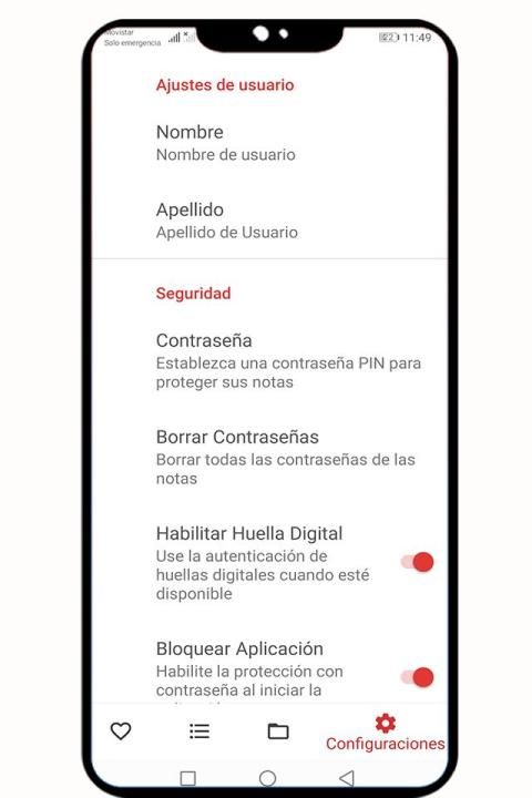 Te incluye dos formas básicas para escribir tus Nota Bloc diarias, y escribir tus Notas Rápidas así como tareas de libreta Rápida, puedes agregar el color favorito, y el color de fondo a tu texto de tu lista de tareas, y así poder identificar el color de tus Notas y Nuevas Tareas. ya que puedes ocultar tus Notas con contraseña, y para hacer más rápida la búsqueda de tus Notas también puedes agregar tu huella Para desbloquear tus Notas.