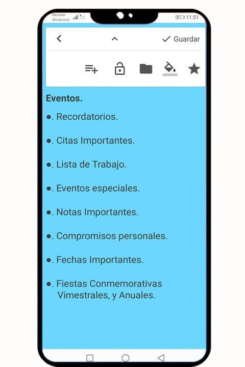 Todas tus Notas, las puedes crear a tu programa de todos tus Eventos y Recordatorios y Citas agregadas a tu lista de tareas programadas, ya que puedes hacer de tu Lista de Nota Bloc el procesamiento de textos que tu quieras, Creando Colores de Notas con el color favorito que más te Guste.