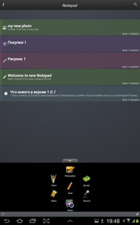 Yang paling mudah dan sederhana notepad untuk smartphone dan tablet di Android! Dropbox menyimpan catatan Anda dan Anda don `t perlu khawatir tentang keselamatan mereka. Untuk bisnis dan sibuk orang memiliki fungsi pengingat. Anda juga dapat mengatur sandi untuk melindungi catatan Anda dari mata asing. Ini dan fitur lain yang menunggu Anda di notepad kami.