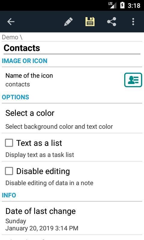 3. For "Text as a list" added new options to the "Properties of the note": "Sorting", "Last modified date".