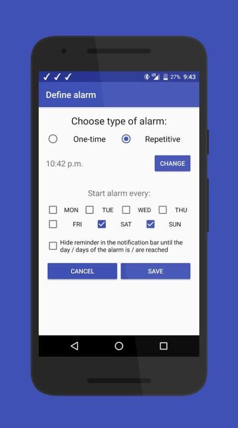 Setiap saat ketika Anda melihat perangkat Anda, Anda mengenali pengingat dalam Pemberitahuan Bar sehingga Anda tidak akan melupakan tugas tertentu, pertemuan, penyelesaian atau apa pun. Selanjutnya, jika pengingat tertentu harus dilakukan sampai waktu tertentu, Anda dapat juga mengatur alarm. alarm akan mengingatkan Anda pada saat Anda memilih menggunakan suara, getaran dan / atau LED. Berkat fitur dasar, maka hampir tidak mungkin untuk melupakan tugas penting, rapat atau penyelesaian.