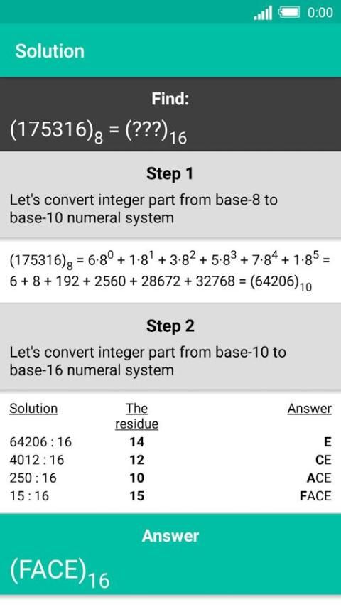 Program ini memungkinkan untuk mengkonversi angka (termasuk pecahan desimal) antara sistem nomor dengan basis dari 2 sampai 36. Juga, ia mampu beroperasi antara 2 nomor dalam sistem nomor yang berbeda dan output hasil penambahan / pengurangan / perkalian / pembagian. Program ini sangat mudah digunakan dan memiliki kesempatan untuk menampilkan algoritma solusi.