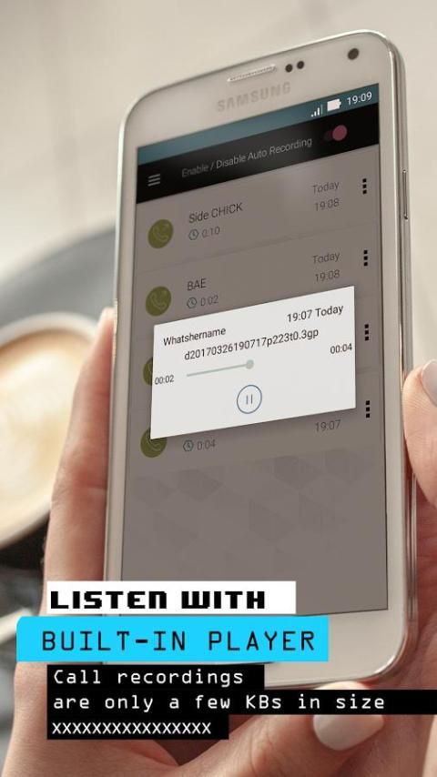 Enable and disable automatic phone call recording with one tap. Saved recordings only take up a few KBs of space. Listen with in-app audio player. You can upload to ol' Cloud Storage too with your Google Play Services Account.