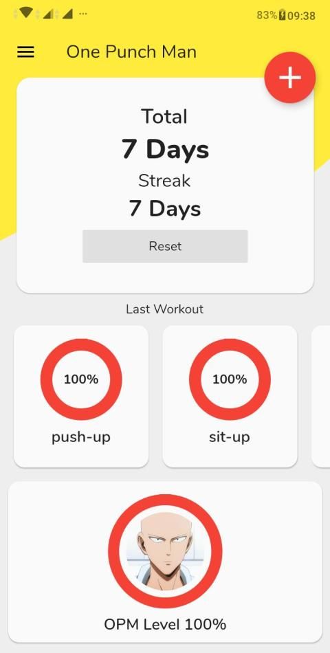 Pelacak Latihan One Punch Man melacak jumlah latihan yang dilakukan dalam sehari. Tantangan One Punch Man termasuk melakukan 100 squat, 100 pushups, 100 situps dan lari 10 km setiap hari. Terlepas dari 4 latihan ini, latihan umum lainnya juga ditambahkan dan opsi untuk menyesuaikan jumlah latihan.