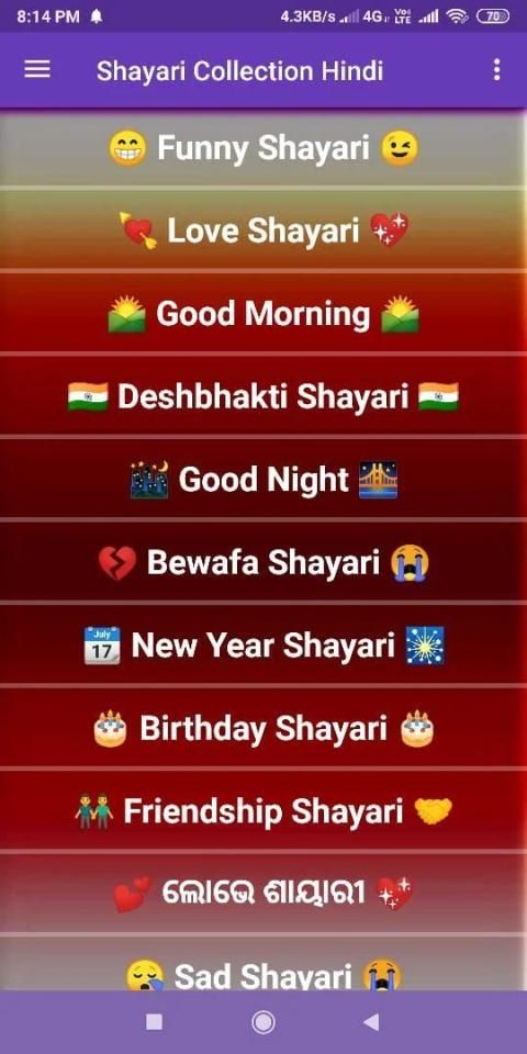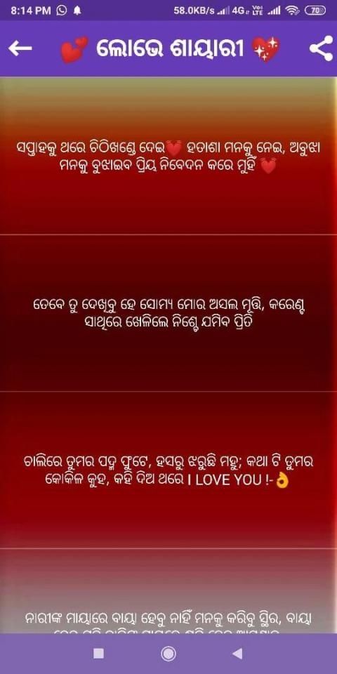 Odia Shayari app contain Unique Odia Romantic Shayari.The Odia romantic shayari collection updated on regular interval.Please update the app to get new Odia romantic shayari collection on your phone regularly