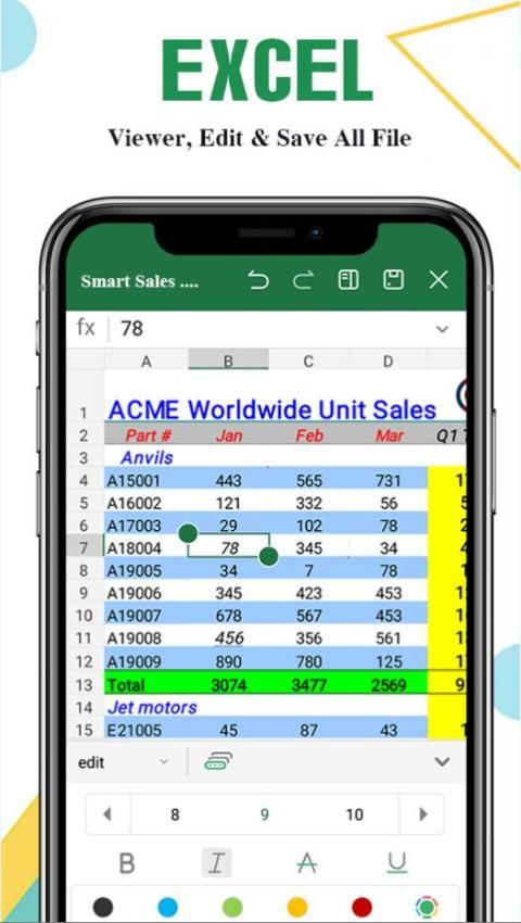 ☲ Excel Editing - Office Mobile for android enables quick editing on Word, Excel and PowerPoint documents