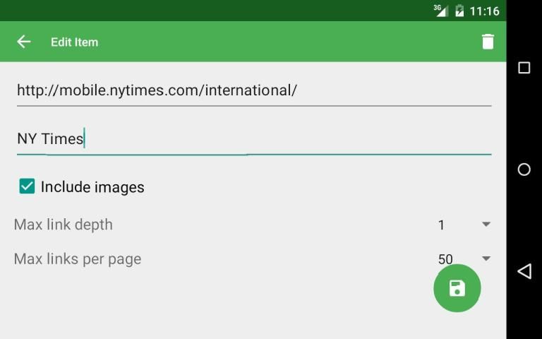 2. Ubah konfigurasi Item: mengatur URL & judul situs web dan pilih kedalaman link dan jumlah maksimum link per halaman untuk mengikuti * kemudian tekan save icon (mungkin tersembunyi di balik keyboard) untuk menyimpan item. Anda dapat mengedit konfigurasi item yang kemudian dengan klik panjang pada item.