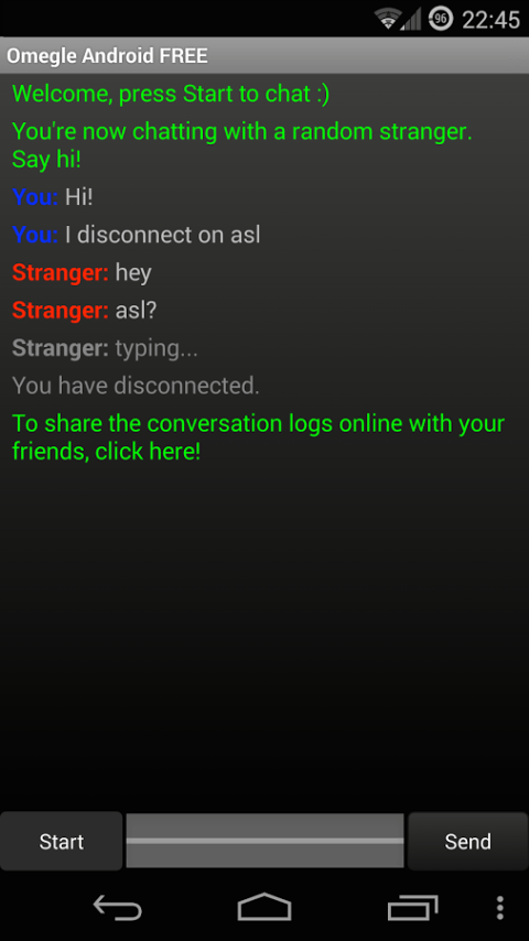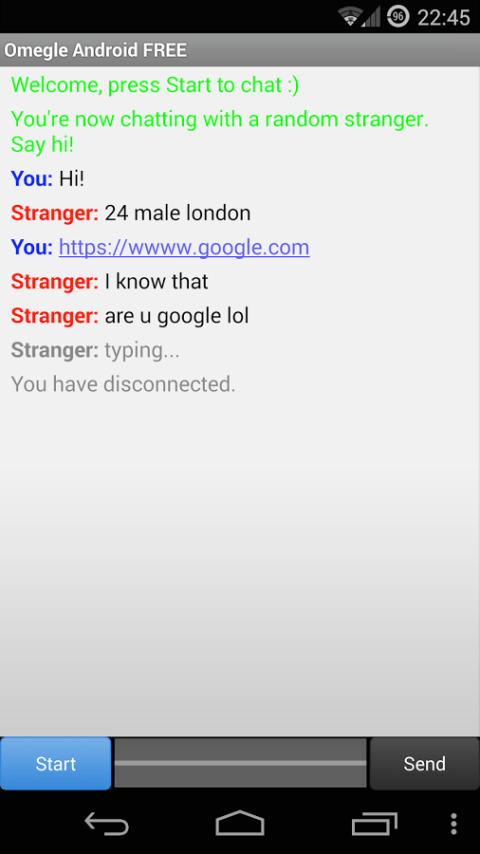 Talking to strangers has never been easier. Chat with a person picked randomly from thousands of users on Omegle.com web site. Conversations are totally anonymous. Simple, fast and clean interface, for the best mobile Omegle experience!