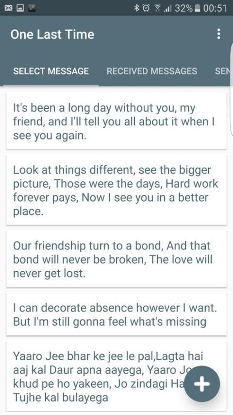 Kadang-kadang hidup tidak memberi Anda kesempatan untuk mengatakan yang tepat Good Bye. Anda dapat menggunakan aplikasi ini untuk mengirim, satu pesan yang tercinta Anda, mengungkapkan perasaan hati Anda untuk mereka. Tidak seperti aplikasi lain kita memiliki fitur unik berikut.