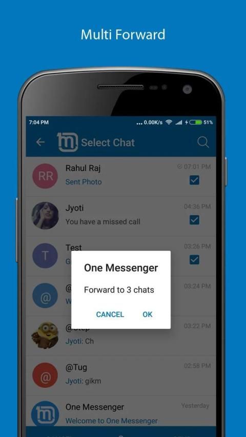 One Messenger membuat koneksi dengan teman lebih mudah terlepas dari media apa (Aplikasi, email atau SMS) yang mereka gunakan. Mereka tidak perlu menginstal aplikasi untuk berkomunikasi dengan mereka. Mereka dapat menerima pesan Anda melalui email, SMS gratis (terbatas), atau panggilan telepon, sesuai pilihan Anda.