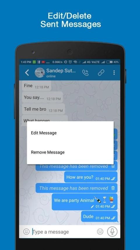 ● EDIT/DELETE SENT MESSAGES: Its a unique option allows you to edit or completely remove any sent message from all devices. Any mistake can be edited now :)