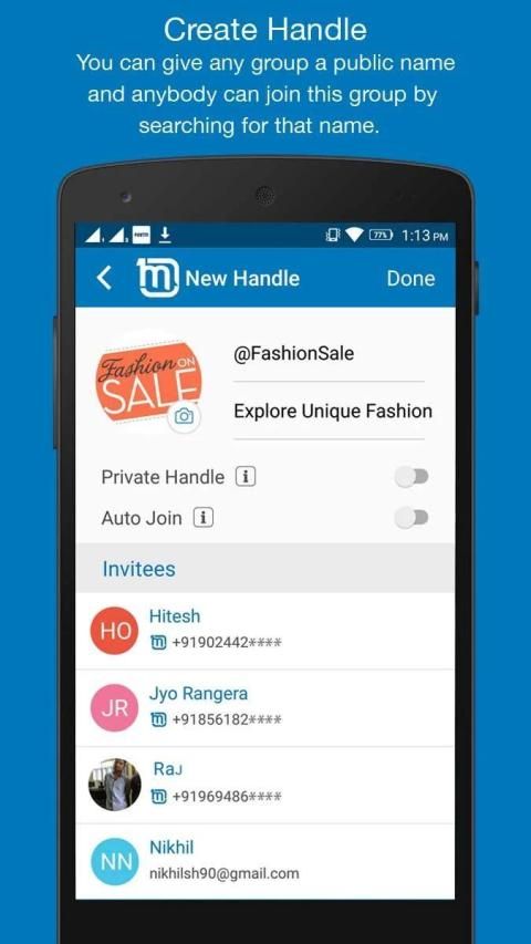 ● CREATE HANDLES (Public/Private Groups): You can give unique searchable names to your public/private groups. Anyone can search them in the app and join. The admin can allow people to join automatically or require approval.